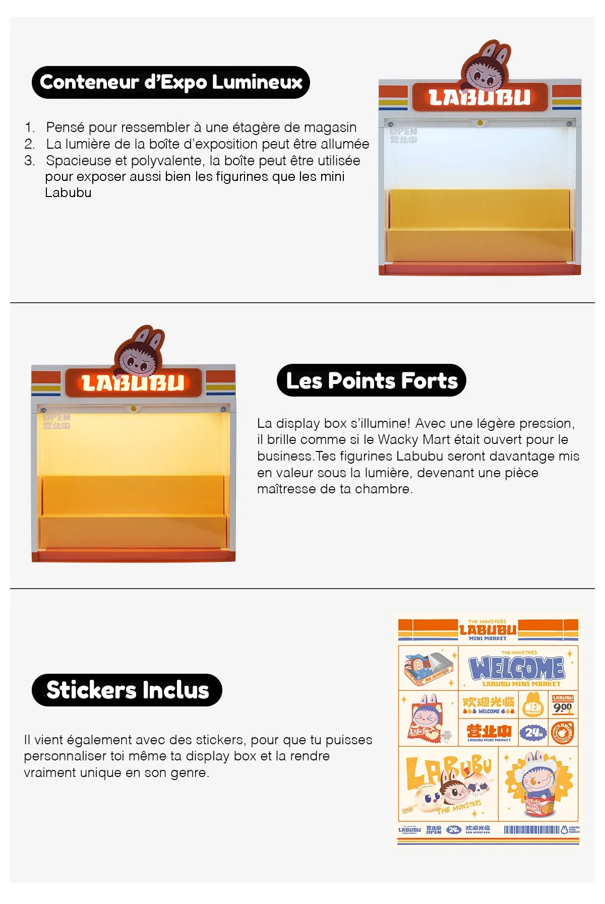 La display box s'illumine! Avec une légère pression, il brille comme si le Wacky Mart était ouvert pour le business. Tes figurines Labubu seront davantage mis en valeur sous la lumière, devenant une pièce maîtresse de ta chambre.